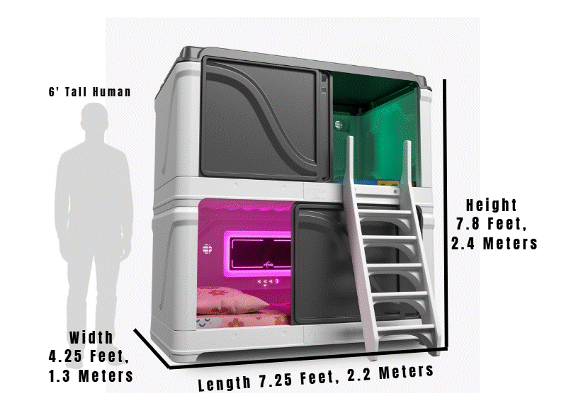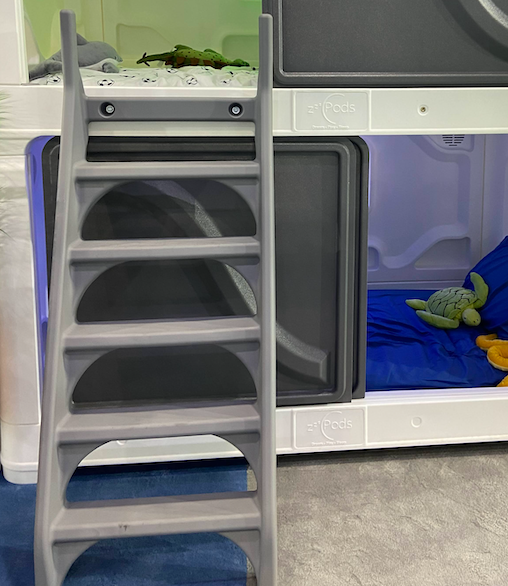 Our zPods Gen 2 double beds, a stackable sleep solution for two, are designed to provide the ideal sleep environment for each sleeper's needs. zPods bed includes an optional control panel, multi-mood LED lighting, fan control, Bluetooth speakers, USB plug-ins, and sliding doors that can be easily removed and reinstalled.